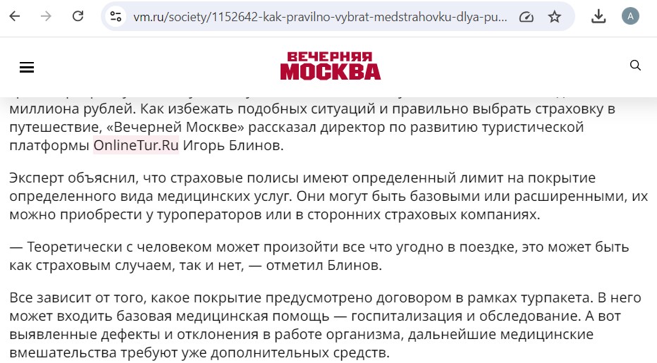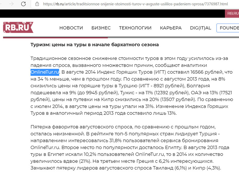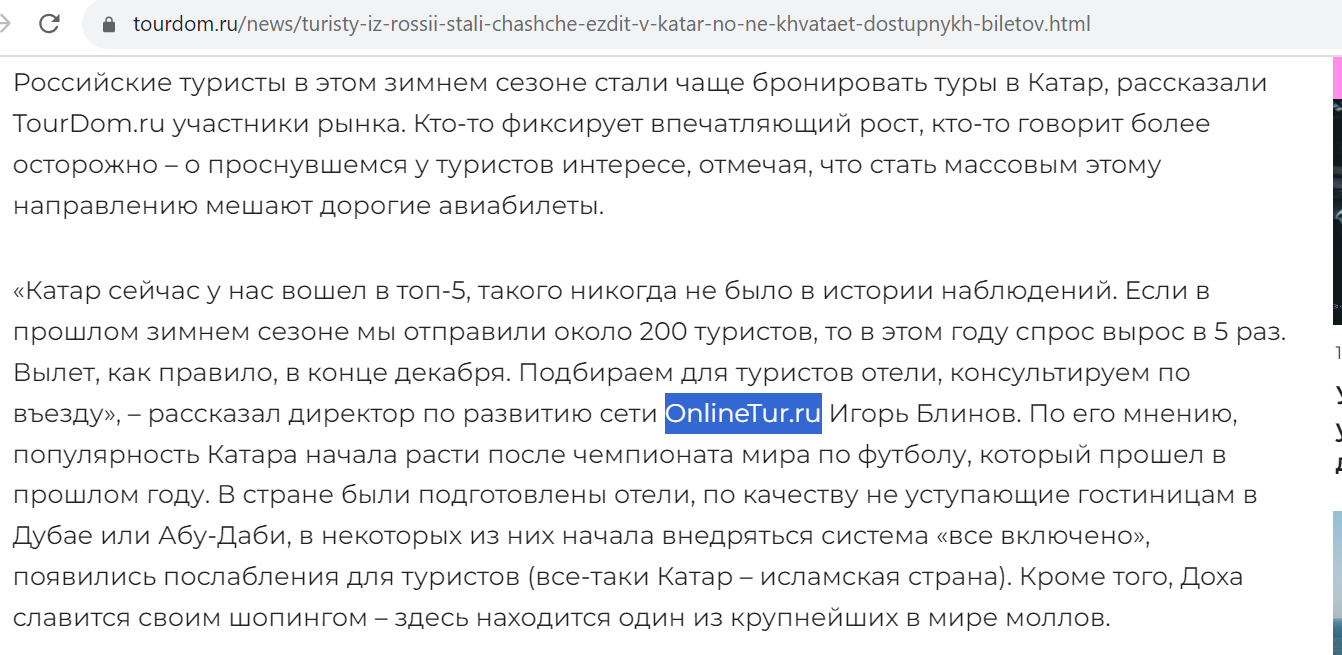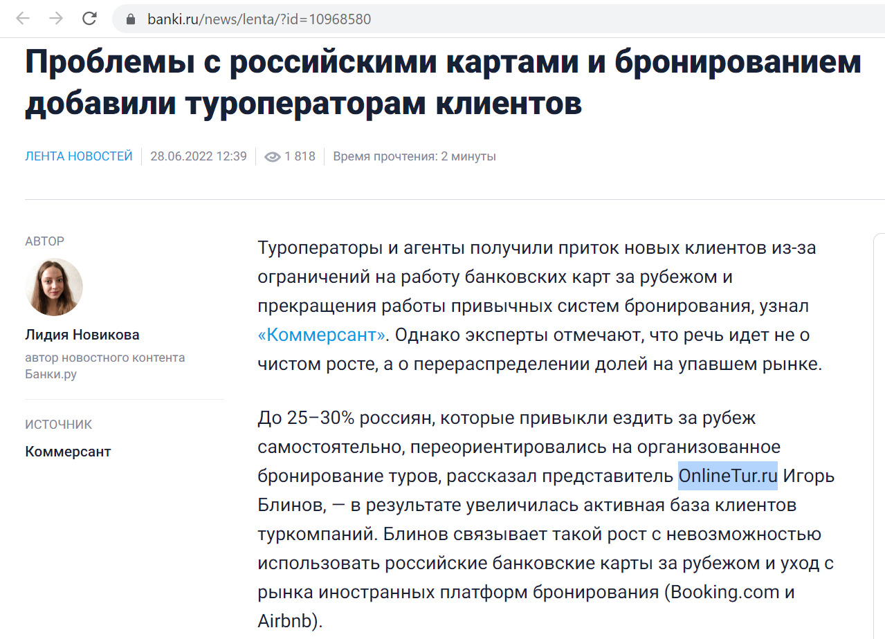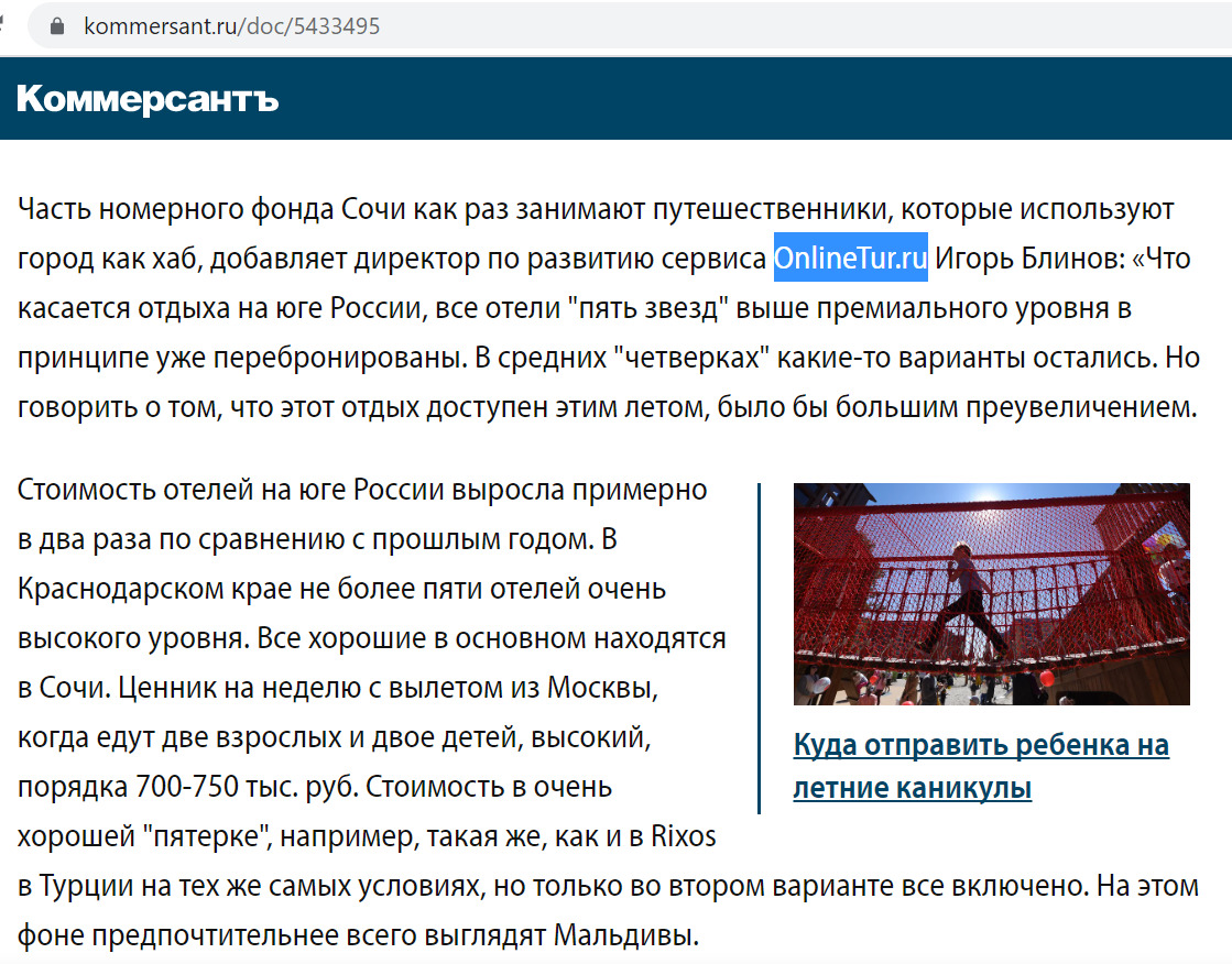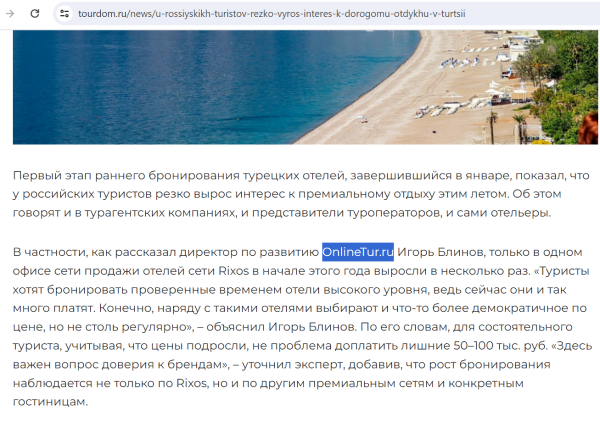Цитируемость OnlineTur.ru в СМИ за 10 лет с 2014 по 2025 год: Коммерсант, РБК, Россия 24, Бизнес ФМ, Вести 24, Россия 1, Ведомости, Известия, Forbes, ПРАЙМ, НТВ, Рен ТВ, Москва FM, Радио России, Вечерняя Москва, News-Life, РИА Новости, Sputnik, Lenta.Ru, Business FM, Общественное телевидение России, Телеканал 360, Московский Комсомолец, Live24.ru, RT, Москва 24, Комсомольская правда, РБК ТВ, Вести ФМ, ТАСС, Российская газета, Газета.Ru, Национальная служба новостей и другие.