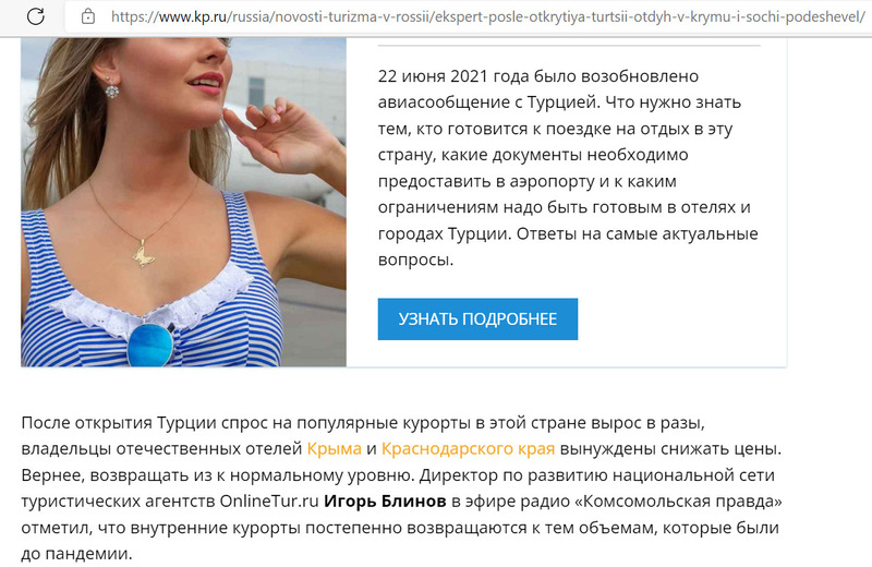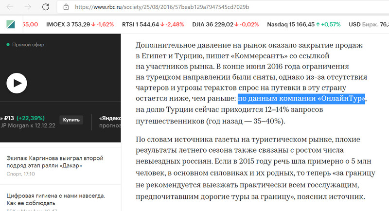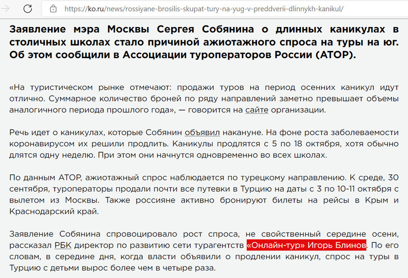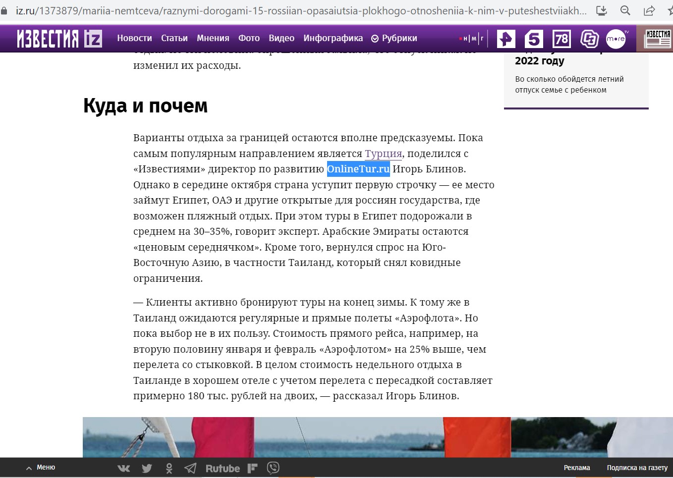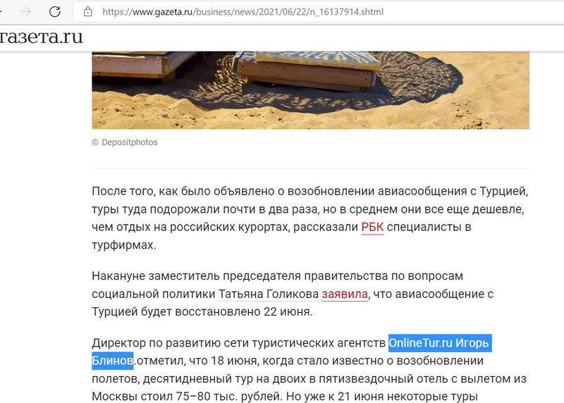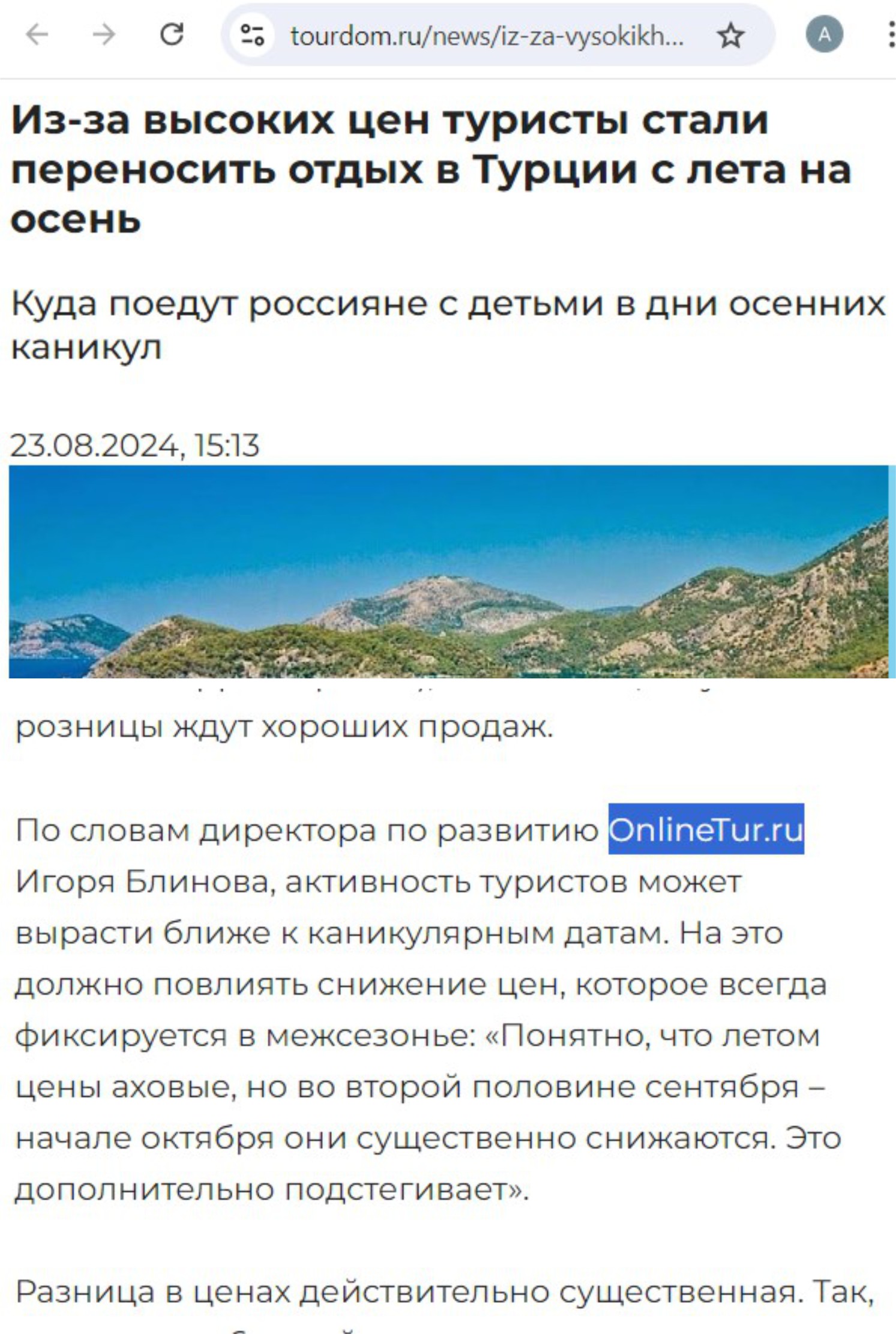 Цитируемость OnlineTur.ru в СМИ за 10 лет с 2014 по 2025 год: Коммерсант, РБК, Россия 24, Бизнес ФМ, Вести 24, Россия 1, Ведомости, Известия, Forbes, ПРАЙМ, НТВ, Рен ТВ, Москва FM, Радио России, Вечерняя Москва, News-Life, РИА Новости, Sputnik, Lenta.Ru, Business FM, Общественное телевидение России, Телеканал 360, Московский Комсомолец, Live24.ru, RT, Москва 24, Комсомольская правда, РБК ТВ, Вести ФМ, ТАСС, Российская газета, Газета.Ru, Национальная служба новостей и другие.